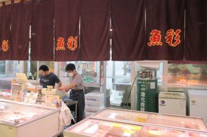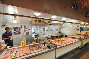 活気に満ち溢れた店内では、仲卸人がプロの目で選んだ、新鮮な魚介類や海産物(マグロから近海魚貝類)、野菜、手作り豆腐まで・・・、